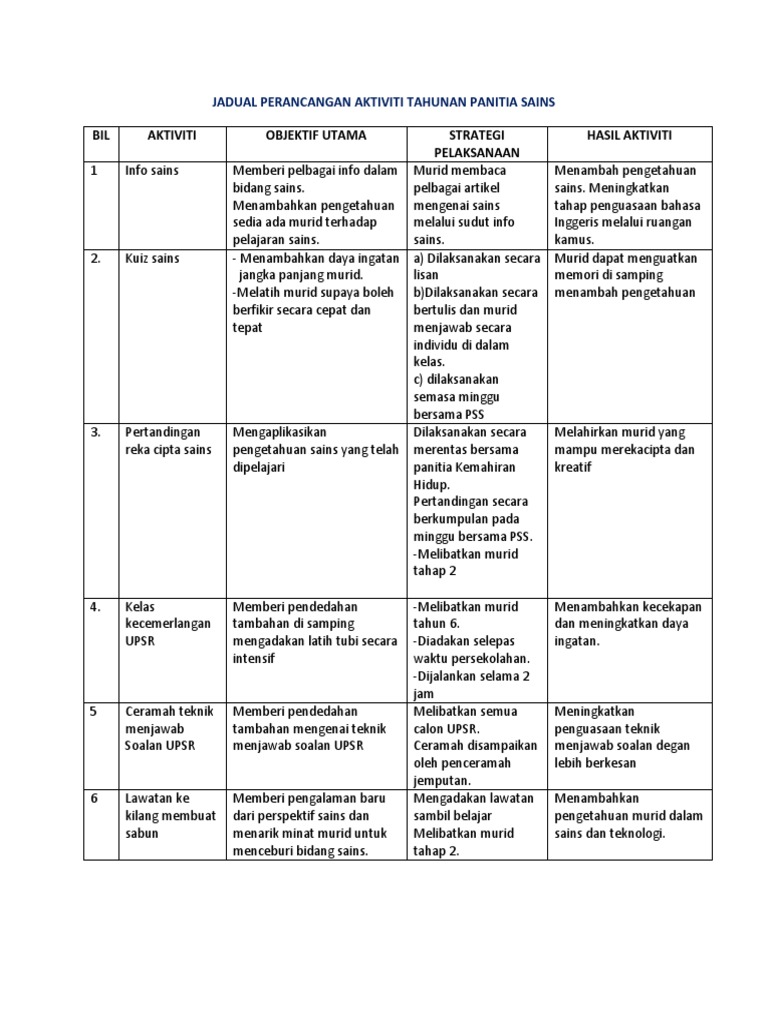 Jadual Perancangan Aktiviti Tahunan Panitia Sains