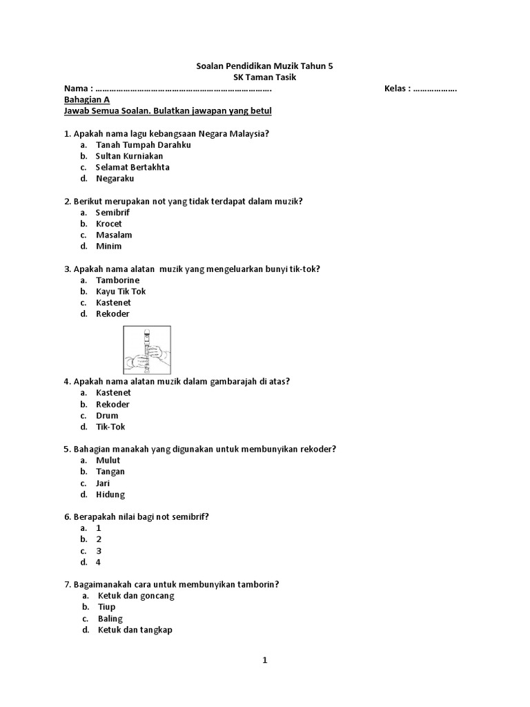 Soalan Pendidikan Muzik Tahun 5 Sk Taman Tasik Nama Kelas Bahagian A Jawab Semua Soalan Bulatkan Jawapan Yang Betul