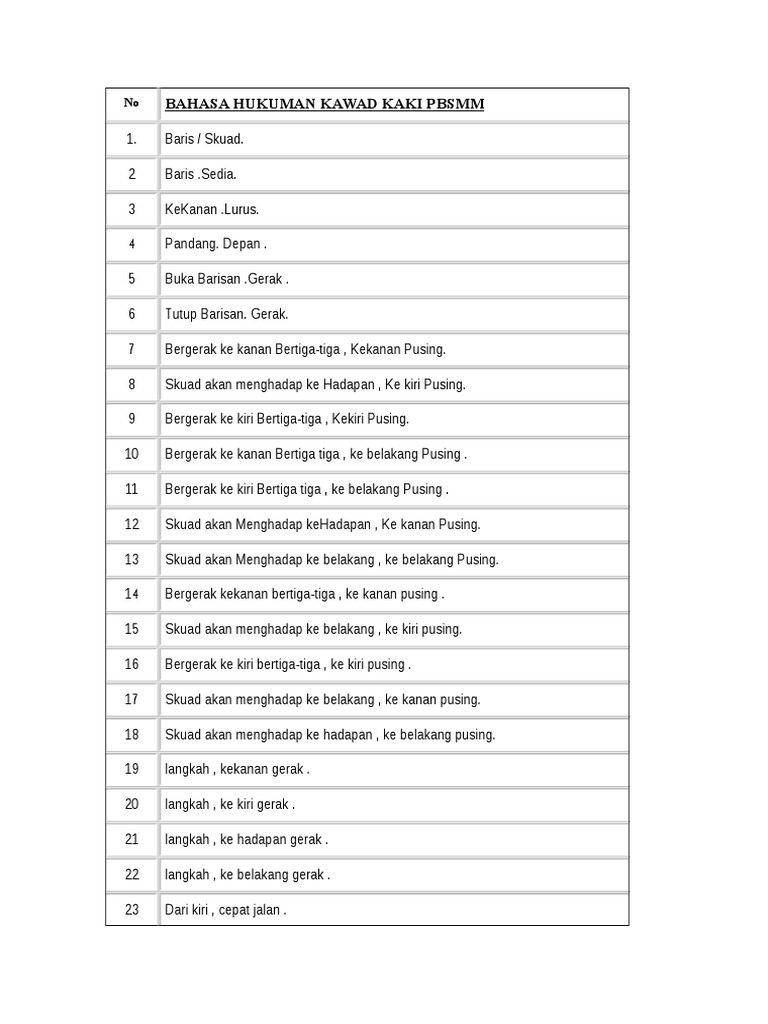 Arahan asas kawad kaki pbsm. Now customize the name of a clipboard to store your clips. Jwb salam kami skuad pengakap tkrs kumpulan seramai orang memohon kebenaran untuk memulakan ujian kawad kaki tuan cth silakan teria kasih tuan komander tabik hormat berpusing dan langkah selangkah ke hadapan. Menghadap ke belakang skuad baris akan menghadap ke semasa perlahan jalan belakang ke kanan kiri pusing kaki yg mengikut. Panduan mengajar kawad kaki.