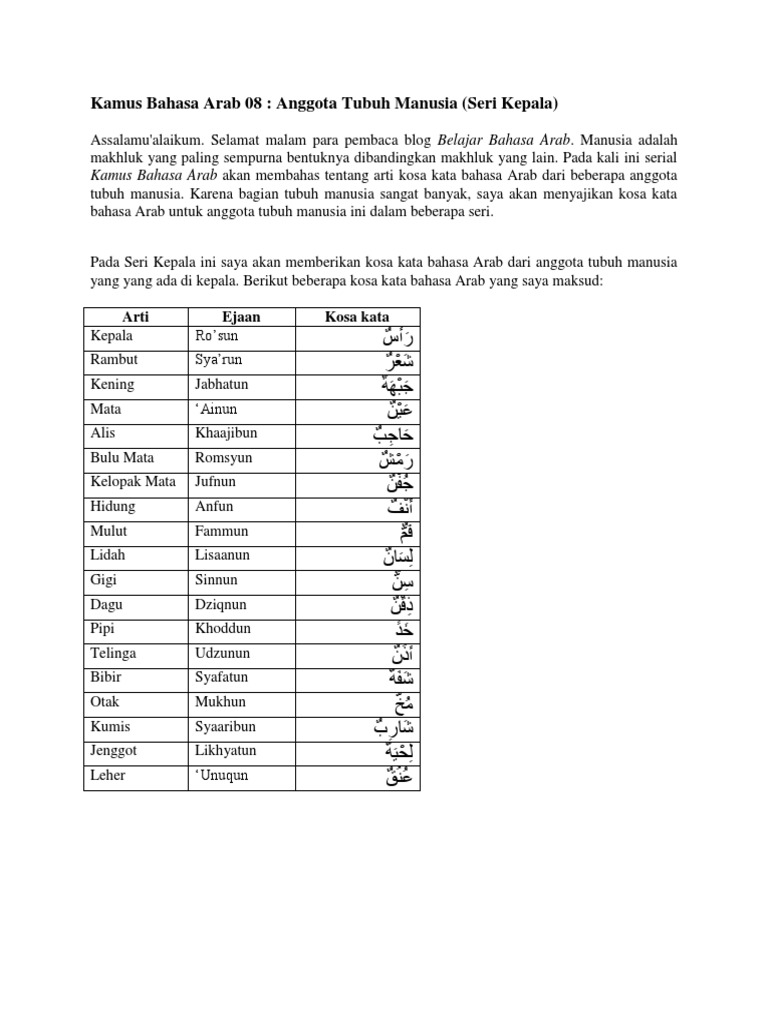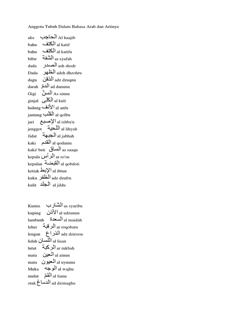 Bahasa Arab Nama Nama Anggota Tubuh Kamus Mufradat