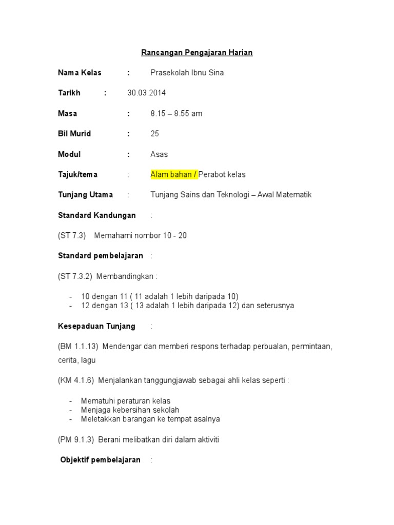 Rancangan Pengajaran Harian Rph Sains Prasekolah