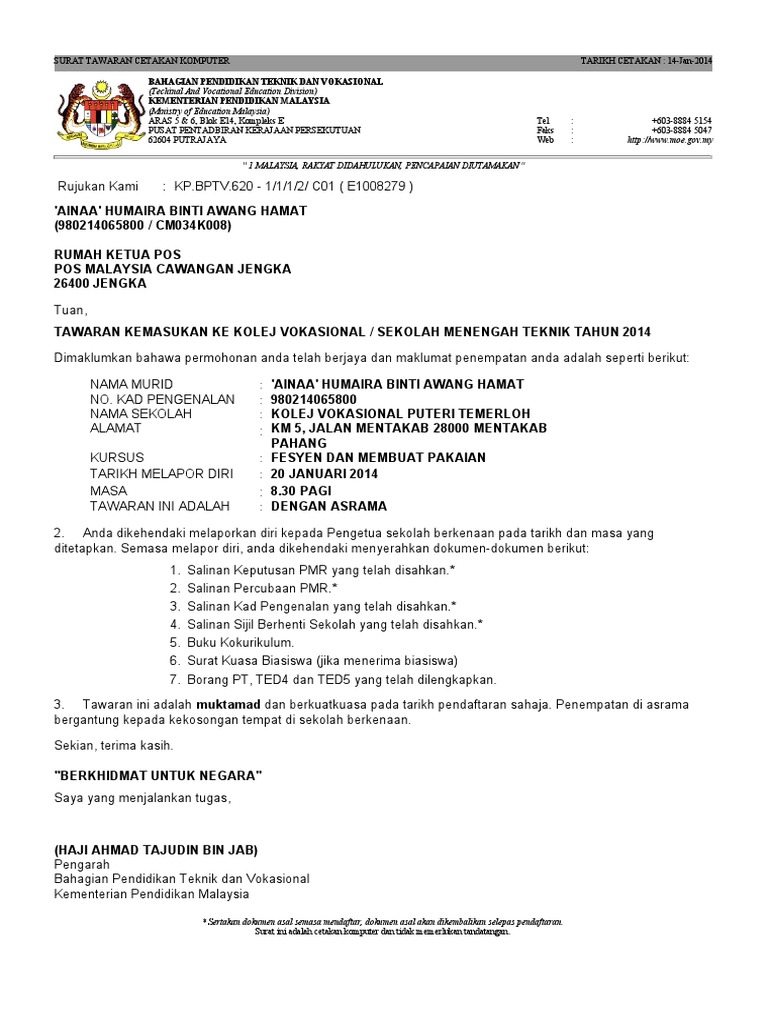 Bahagian pendidikan teknik dan vokasional. Untuk maklumat lebih terperinci dan terkini anda dinasihatkan untuk berhubung terus dengan pihak bahagian pendidikan teknik dan vokasional kementerian pendidikan malaysia. Pengarah bahagian pendidikan teknik dan vokasional bptv zainuren mohd nor berkata kira kira 83 peratus daripada 2 273 pelajar lepasan kv berjaya memperoleh pekerjaan dalam bidang berkaitan sebaik tamat pengajian disember lalu. 2 1 warganegara malaysia 2 2 sihat tubuh badan 2 3 umur tidak melebihi 35 tahun pada 1 januari 2016 2 4 memiliki kelulusan akademik sekurang kurangnya.