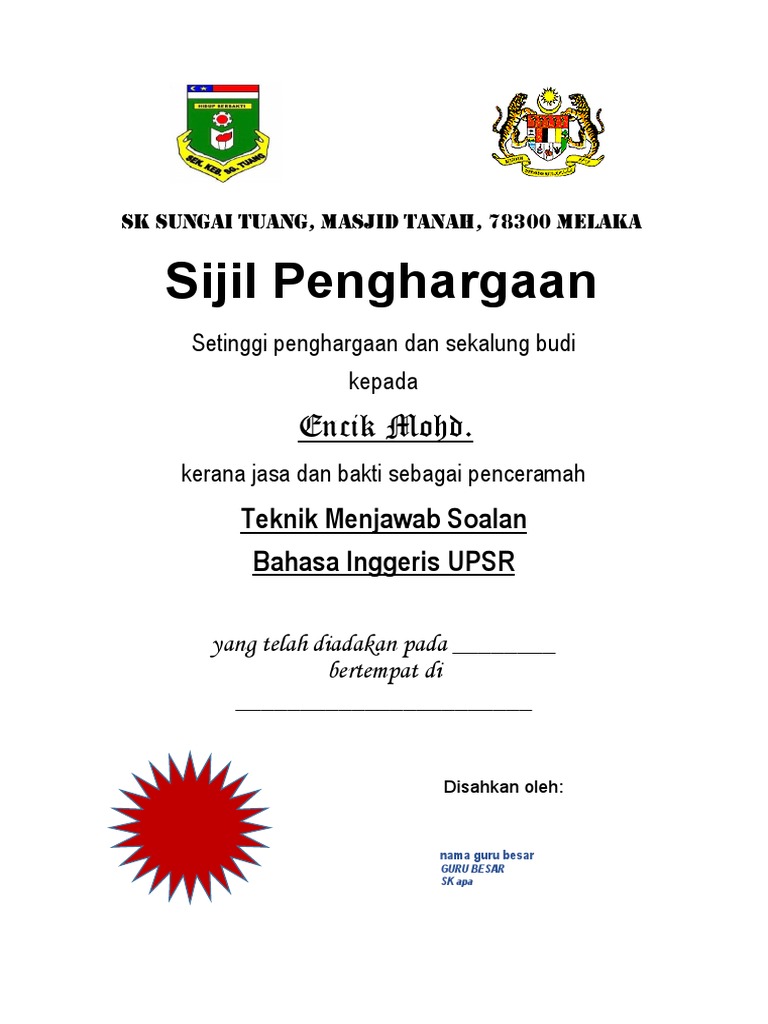 Bahasa Inggeris Contoh Sijil Penghargaan In English