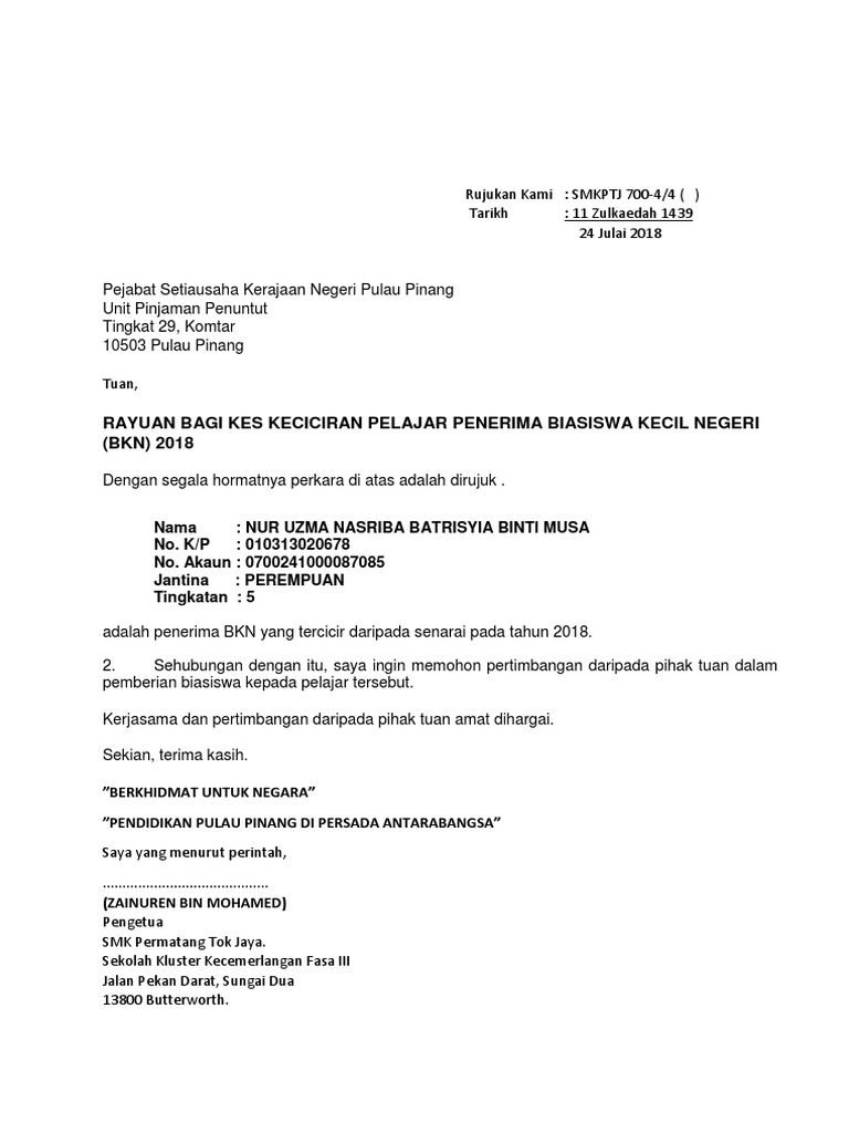 Rayuan Bagi Kes Pelajar Penerima Biasiswa Kecil Negeri Docx