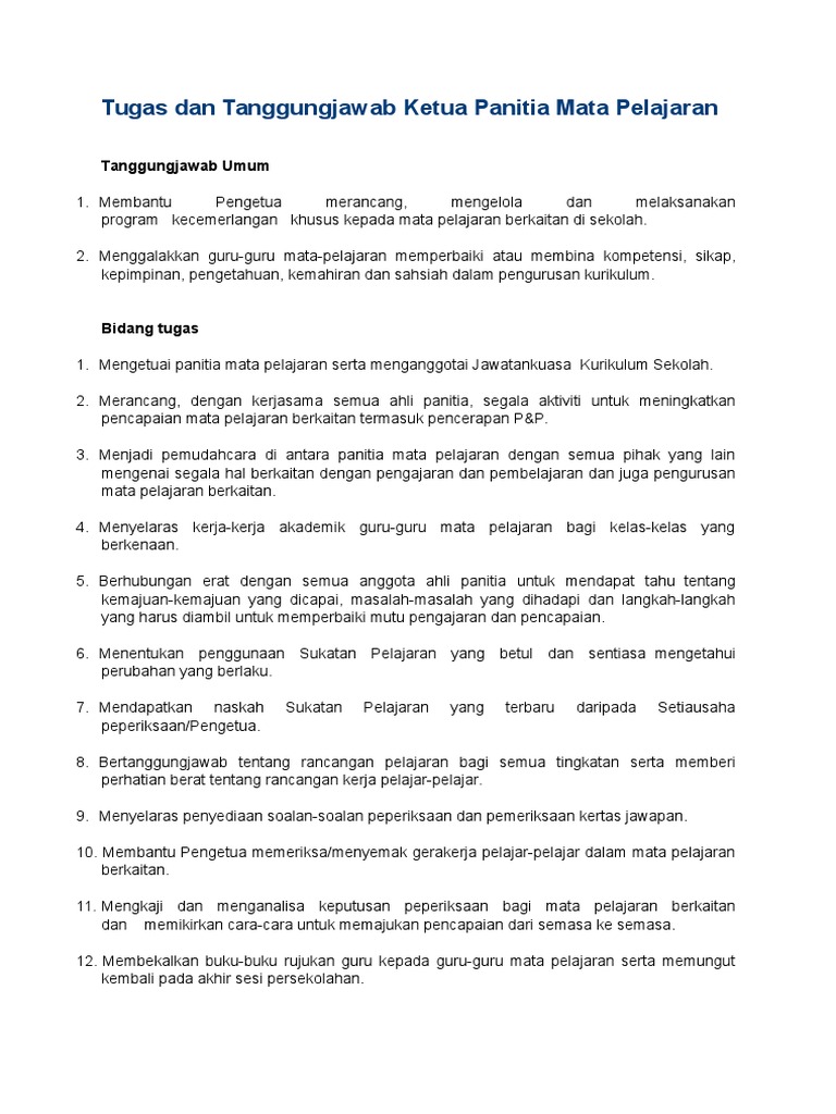Senarai Tugas Dan Tanggungjawab Ketua Panitia Mata Pelajaran