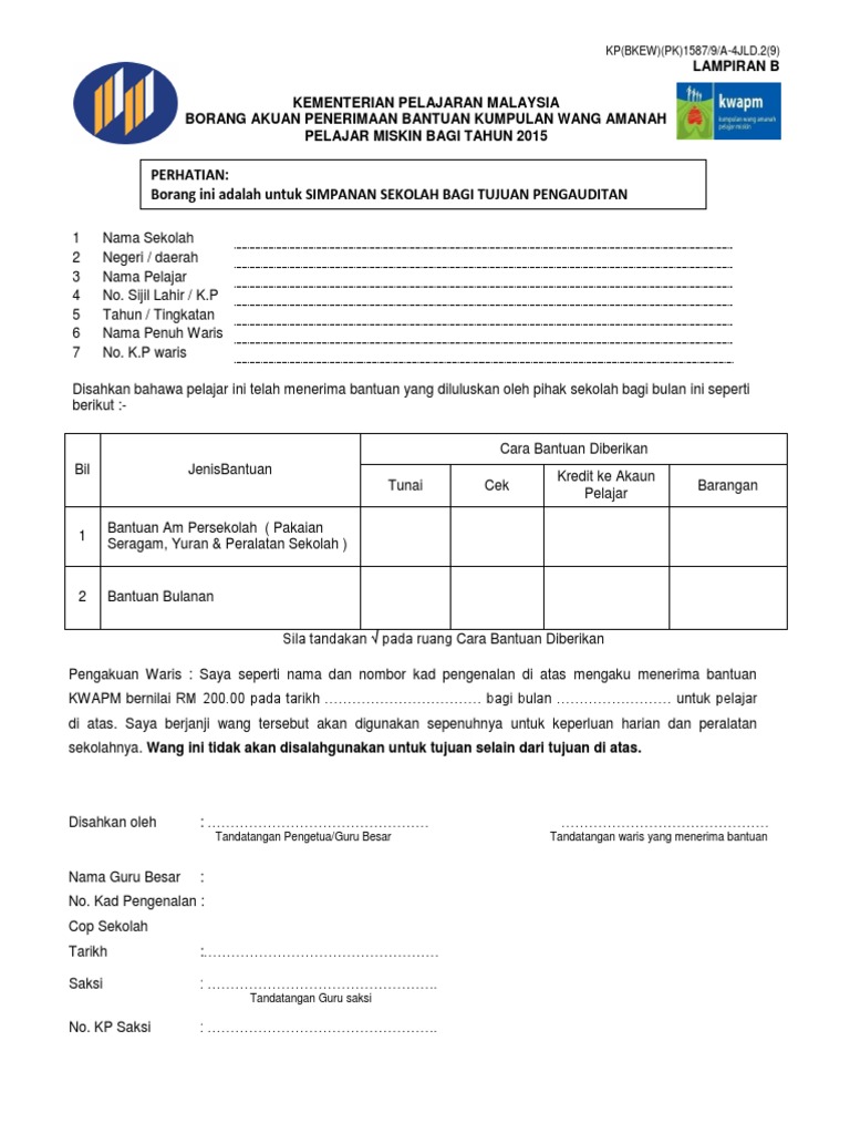 Kementerian Pendidikan Malaysia Borang Akuan Penerimaan Kad Pengenalan Saksi Borang Akuan Penerimaan Bantuan Kumpulan Wang Amanah Pelajar Miskin Bagi Tahun
