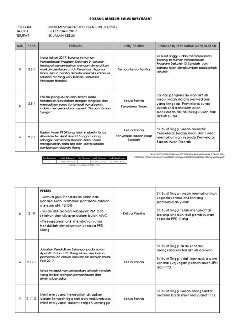 Minit mesyuarat perkara tindakan maklumbalas 4 3 mesyuarat dimaklumkan bahawa jps negeri menghadapi masalah untuk mendapatkan ketua juruaudit dan juruaudit yang menjadi punca kepada kelewatan pelaksanaan audit dalaman di negeri negeri. Contoh borang maklum balas minit mesyuarat 1. Draf minit mesyuarat yang disemak oleh pengerusi. Prosedur mengadakan mesyuarat terutama dari aspek dokumentasi di bawah spsk adalah seperti berikut.