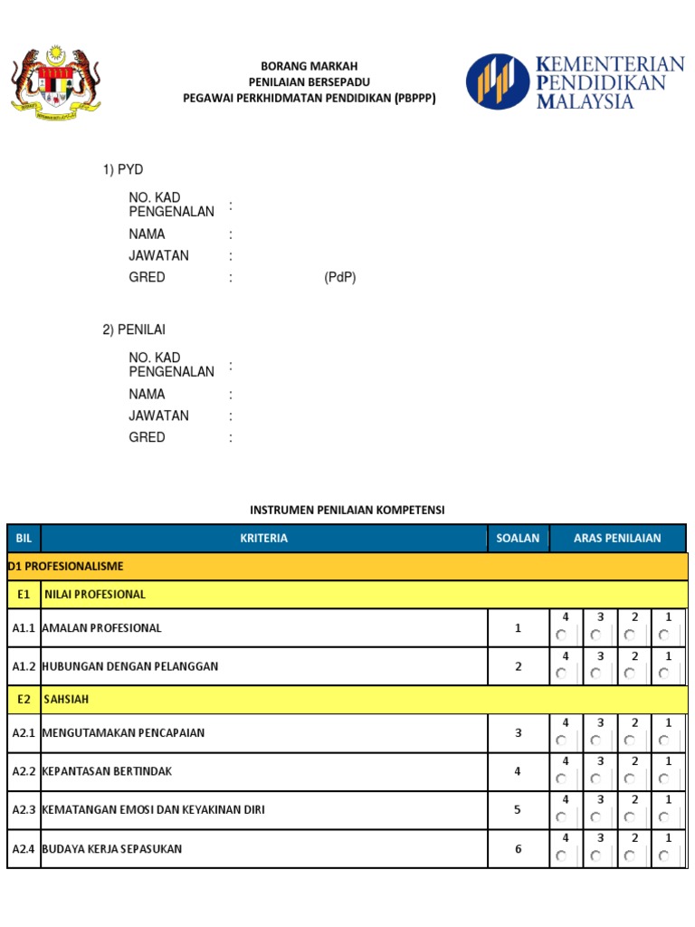 Borang Markah Penilaian Bersepadu Pegawai Perkhidmatan Pendidikan Pbppp